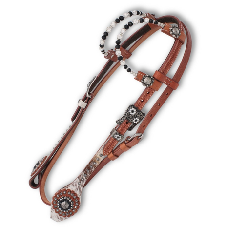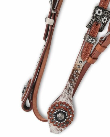 Exclusief westernhoofdstel in two-ear stijl met keelriem, echte cowhide overlay en luxe zilverkleurige details. Dit hoofdstel combineert traditioneel vakwerk met moderne, opvallende accenten. Het is geschikt voor zowel recreatief gebruik als voor wie graag stijlvol voor de dag komt in de arena.